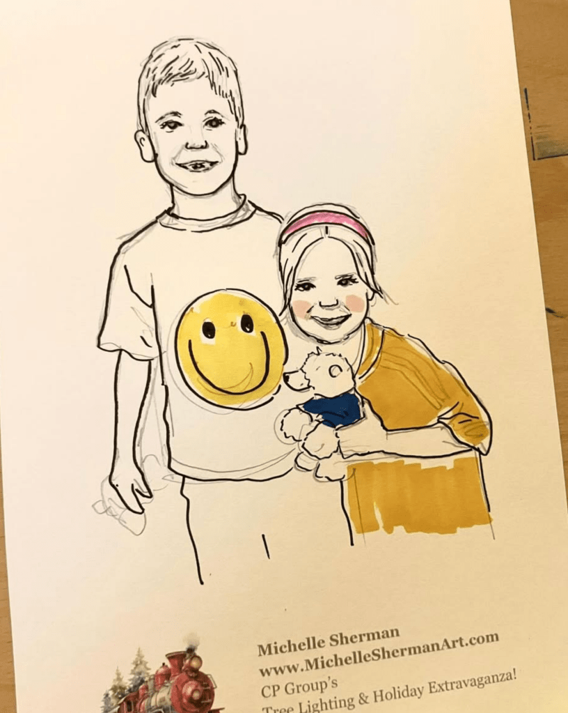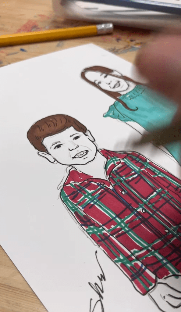 In this type of activation, I will set up a small table where guests will stop by for me to take their photo. In just a few minutes I will have their illustration available to take home. As an add-on, we can provide clear envelopes and backings for guests to take with them. This is sure to delight guests and give them a memory of your event to take home.